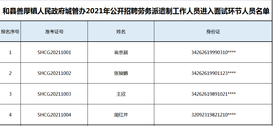 和縣善厚鎮(zhèn)人民政府城管辦2021年公開招聘勞務(wù)派遣制工作人員進(jìn)入面試環(huán)節(jié)名單公告