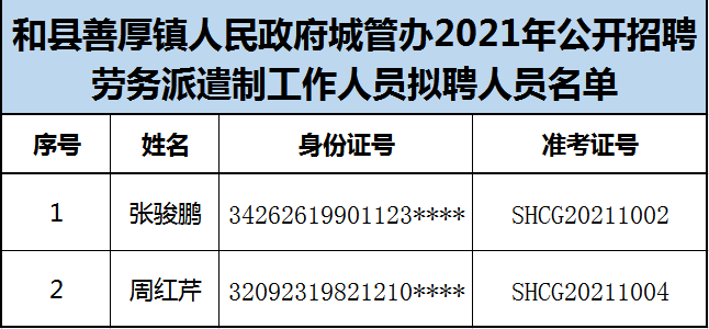 和縣善厚鎮(zhèn)人民政府城管辦2021年公開招聘勞務派遣制工作人員擬聘人員公示